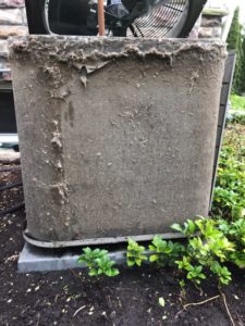 Your equipment may fail prematurely due to the increased strain dirty coils place on its operation. Refrigerant can return to the compressor as a liquid and cause it to fail due to “slugging”. Replacing a compressor is a capital expense that you would probably want to put off until another day. Unfortunately, cleaning evaporator and condenser coils is one of the most overlooked maintenance jobs there is. Although your coils are always getting dirtier, even right now as you read this, it is much easier in the short run to just ignore the problem and hope it won’t catch up with you. However, given enough time, it always will. The longer you go between coil cleanings and the dirtier they get, the more it can cost you. It is much smarter and cheaper in the long run to institute a regular preventative maintenance program with coil cleaning being one of the top priorities. How often is regular? Cleanings should certainly happen at least yearly and perhaps more often, depending on how dirty the environment is in which the coils are operating. Having clean coils makes your system more efficient. Evaporator coils pick up heat from the air circulating inside the building. Condenser coils transfer that heat to the air outside the cooled space. Just by having the evaporator and condenser fans operating and pulling air through the coils, dirt and dust is deposited on them. Dirt and dust are poorer conductors of heat than bare metal, so it takes air passing through dirty metal fins that are attached to the coils of the evaporator and condensing heat exchangers for a longer time to exchange the same amount of heat as clean fins. Dust, especially, can build up over time and reduce the spaces between the fins, so that less air is able to pass through the fins with the same amount of fan power. Let the crud build up as badly as the condenser shown above which is just like an evaporator coil covered with frost that chokes off the airflow, the efficiency of your system will suffer due to increased compressor and evaporator run time.