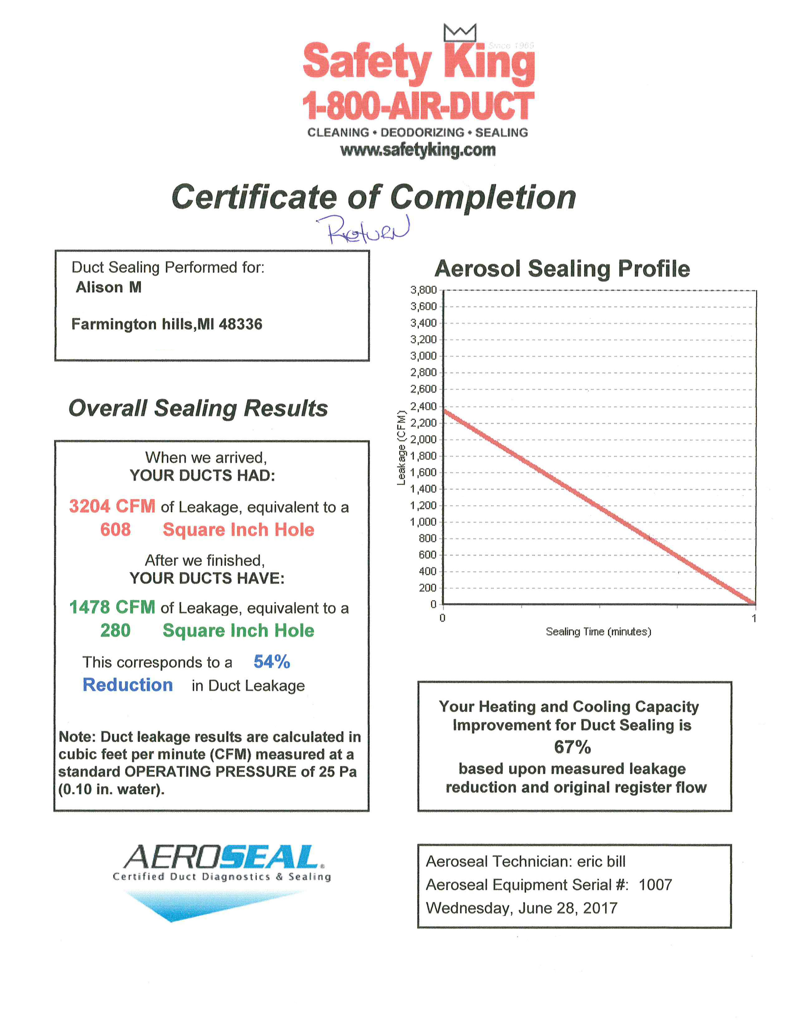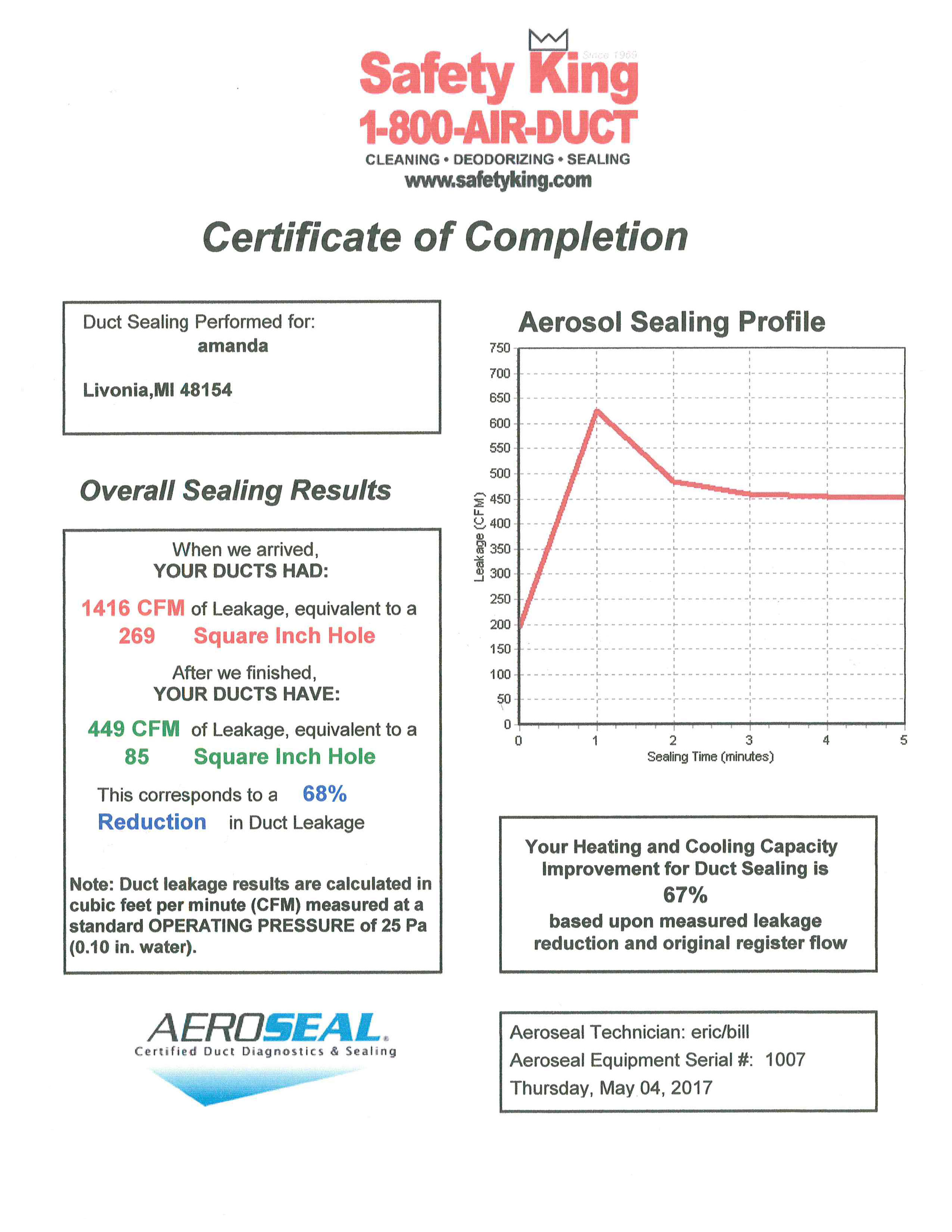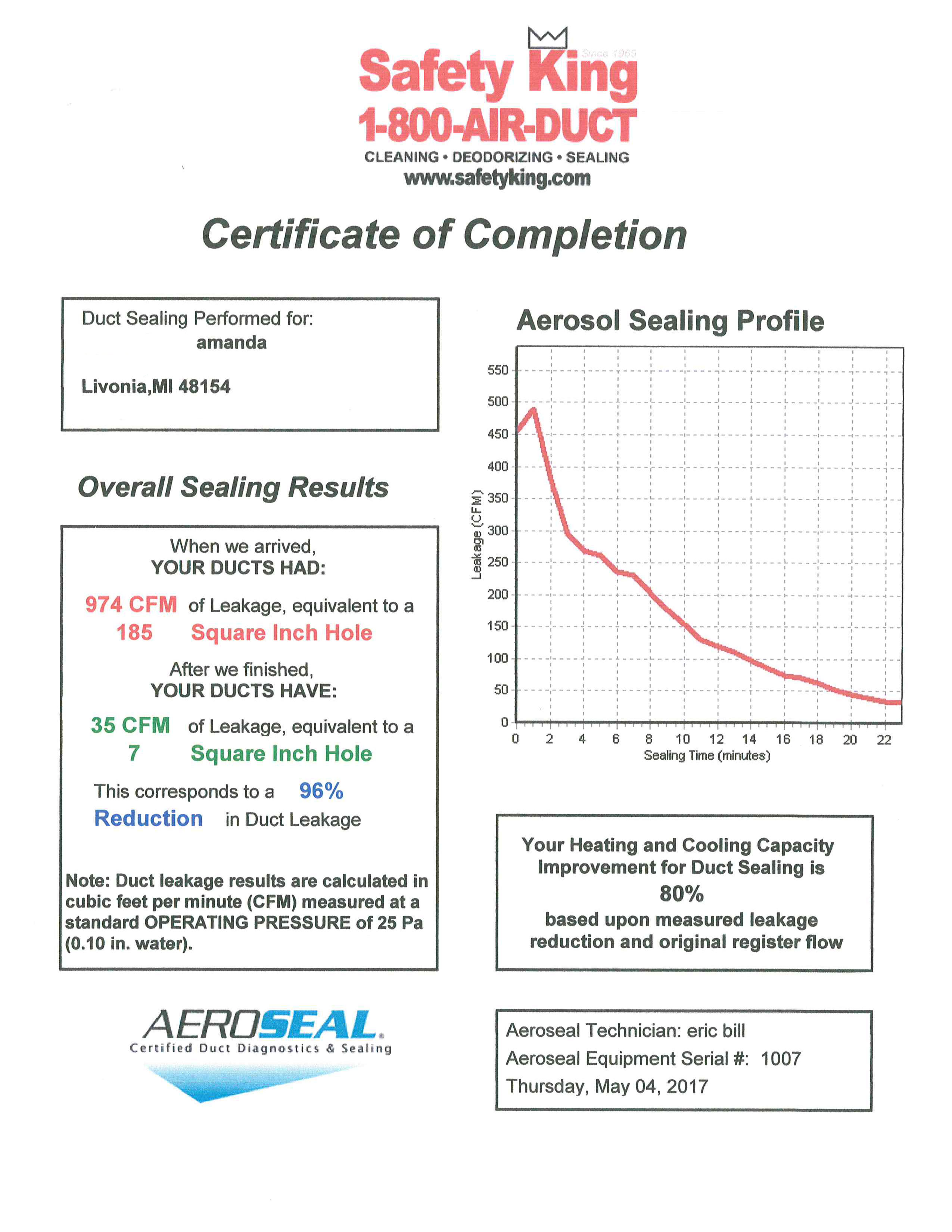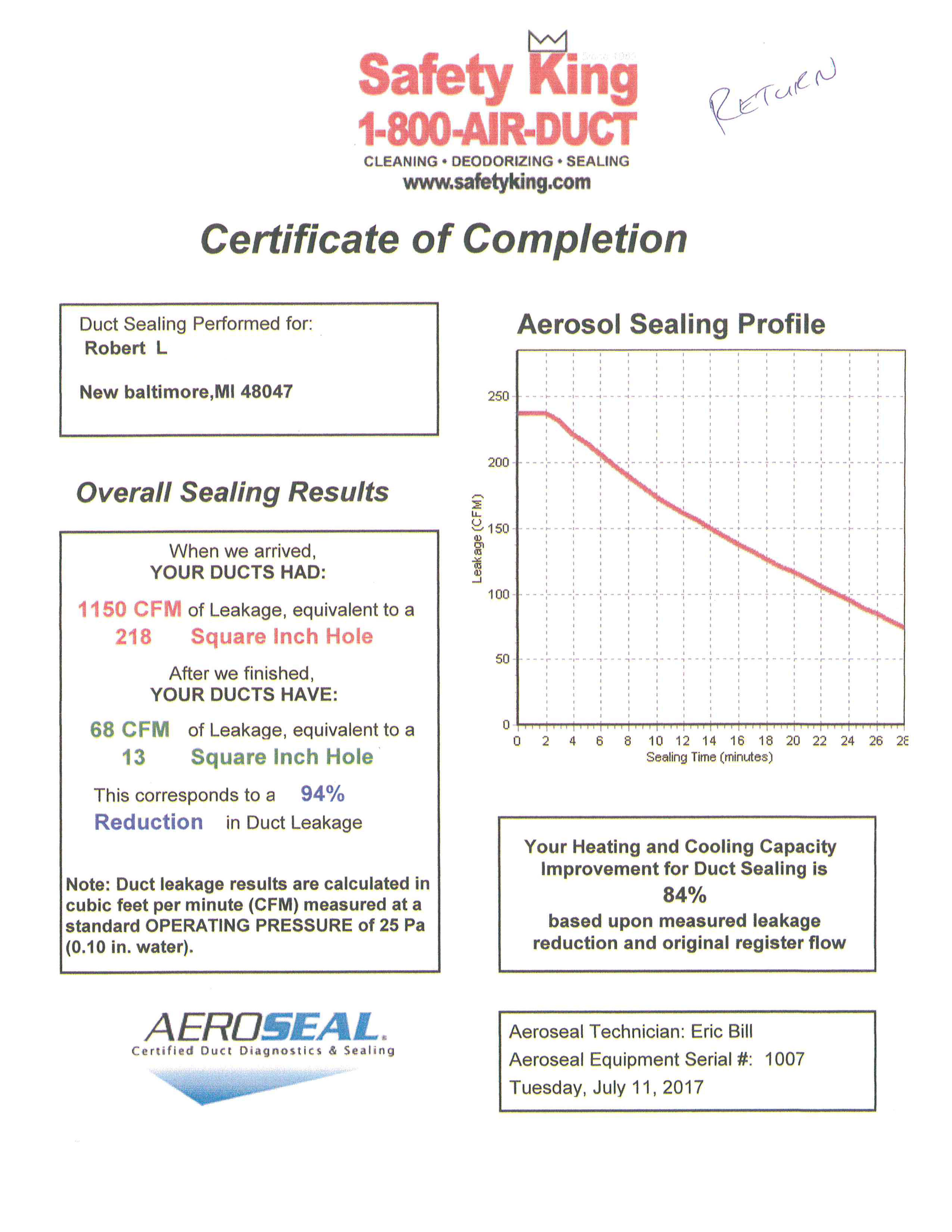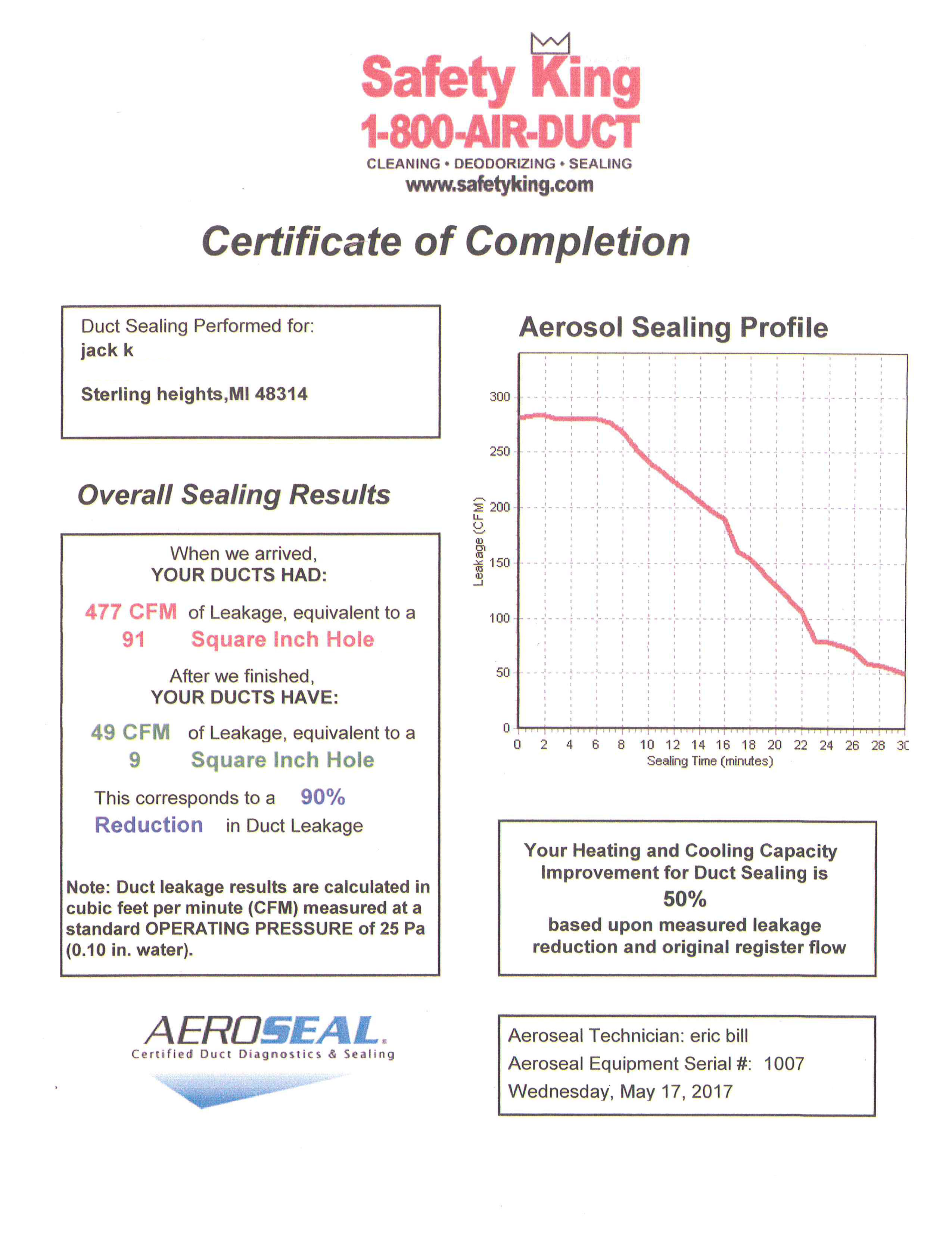 Our Aeroseal specialists have been working hard as the demand for sealed air ducts increases. You can see the results of our process by viewing any of the Certificates of Completion below. Each set of two certificates is the supply and return side of an HVAC system.
