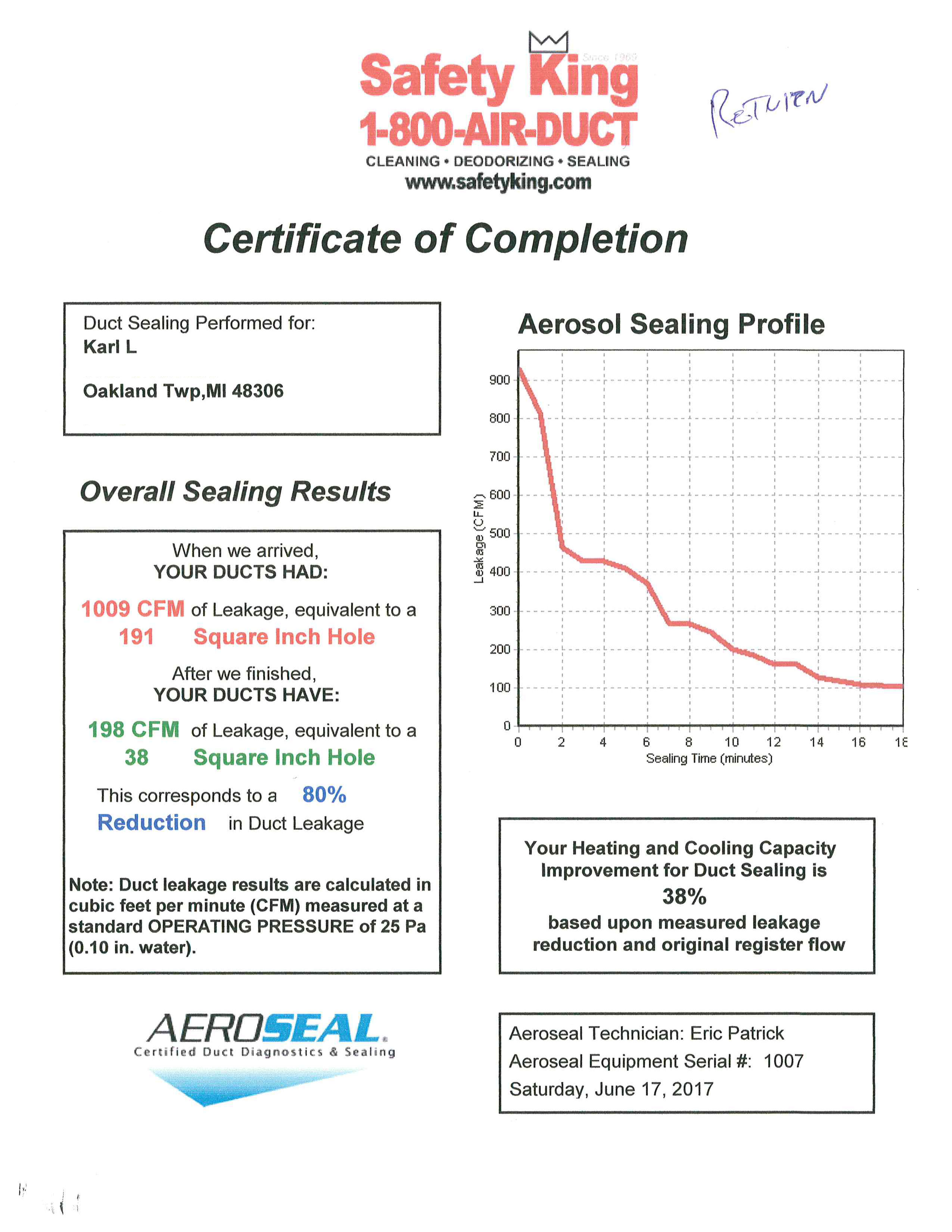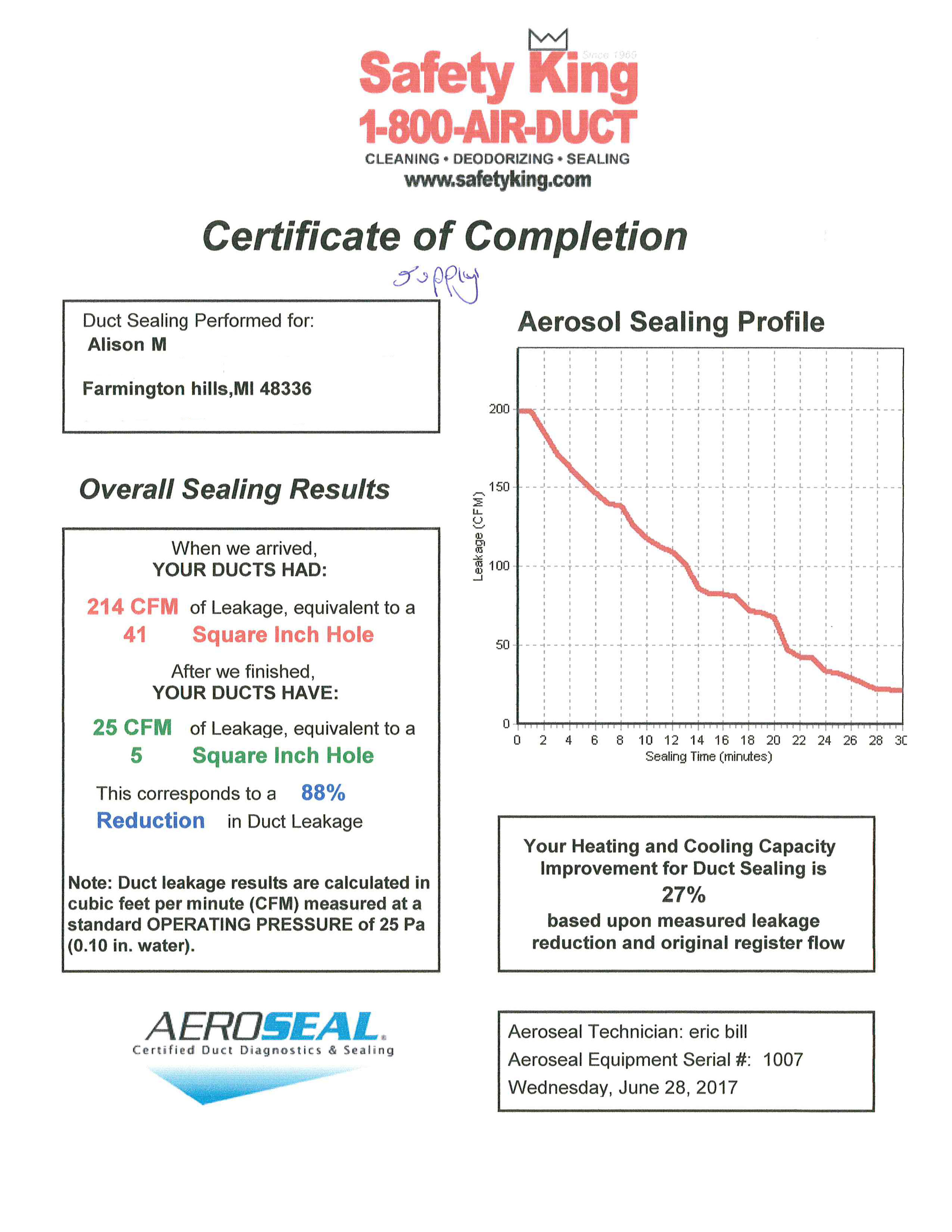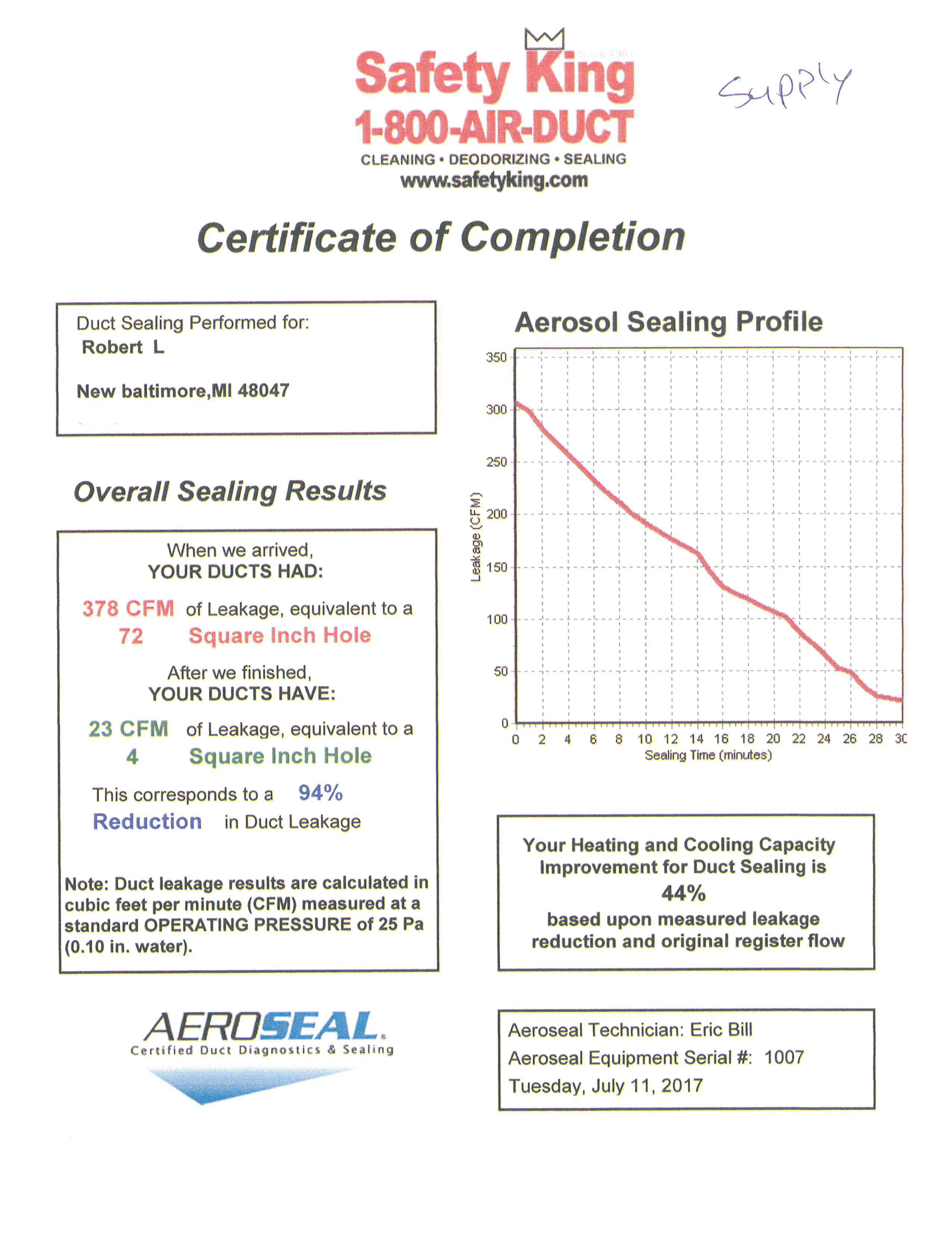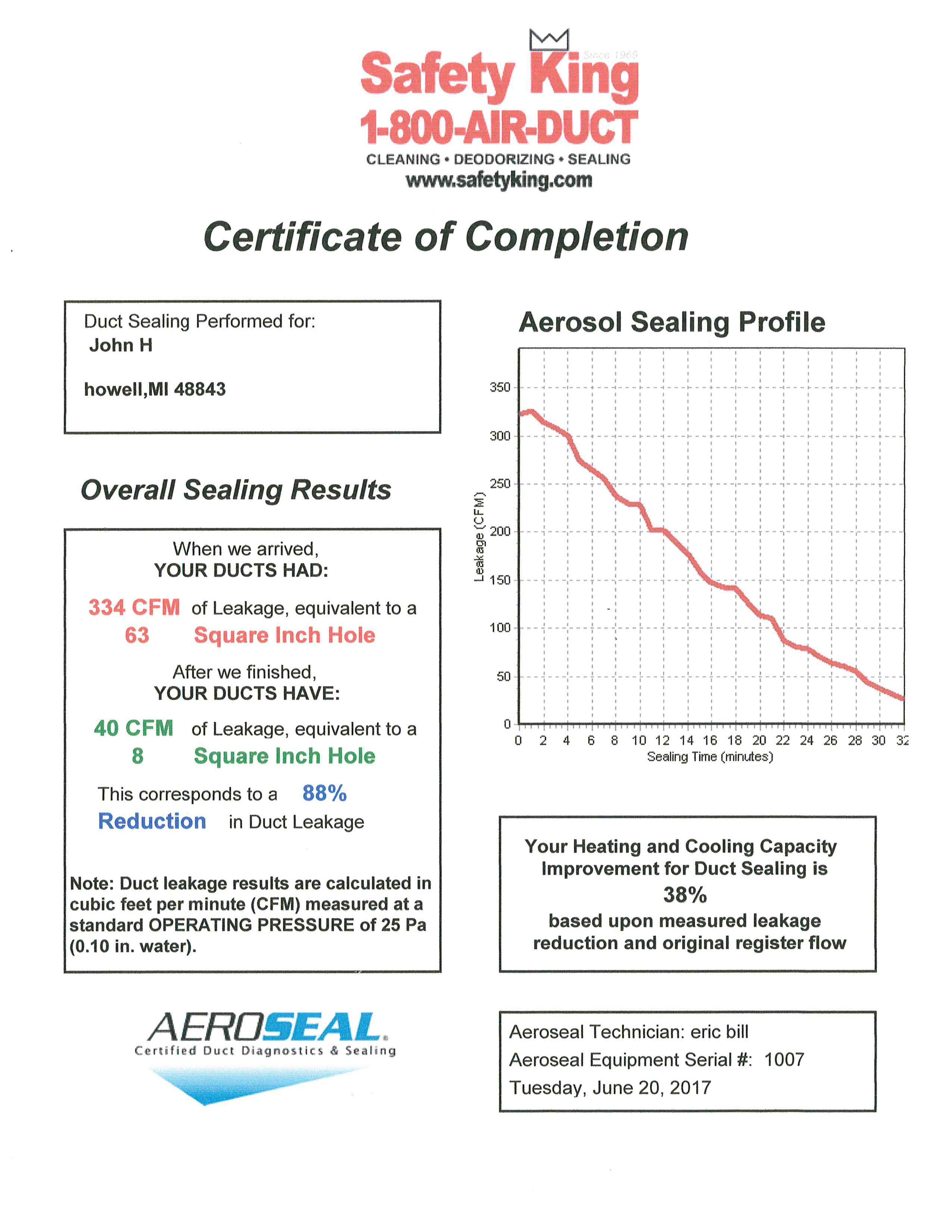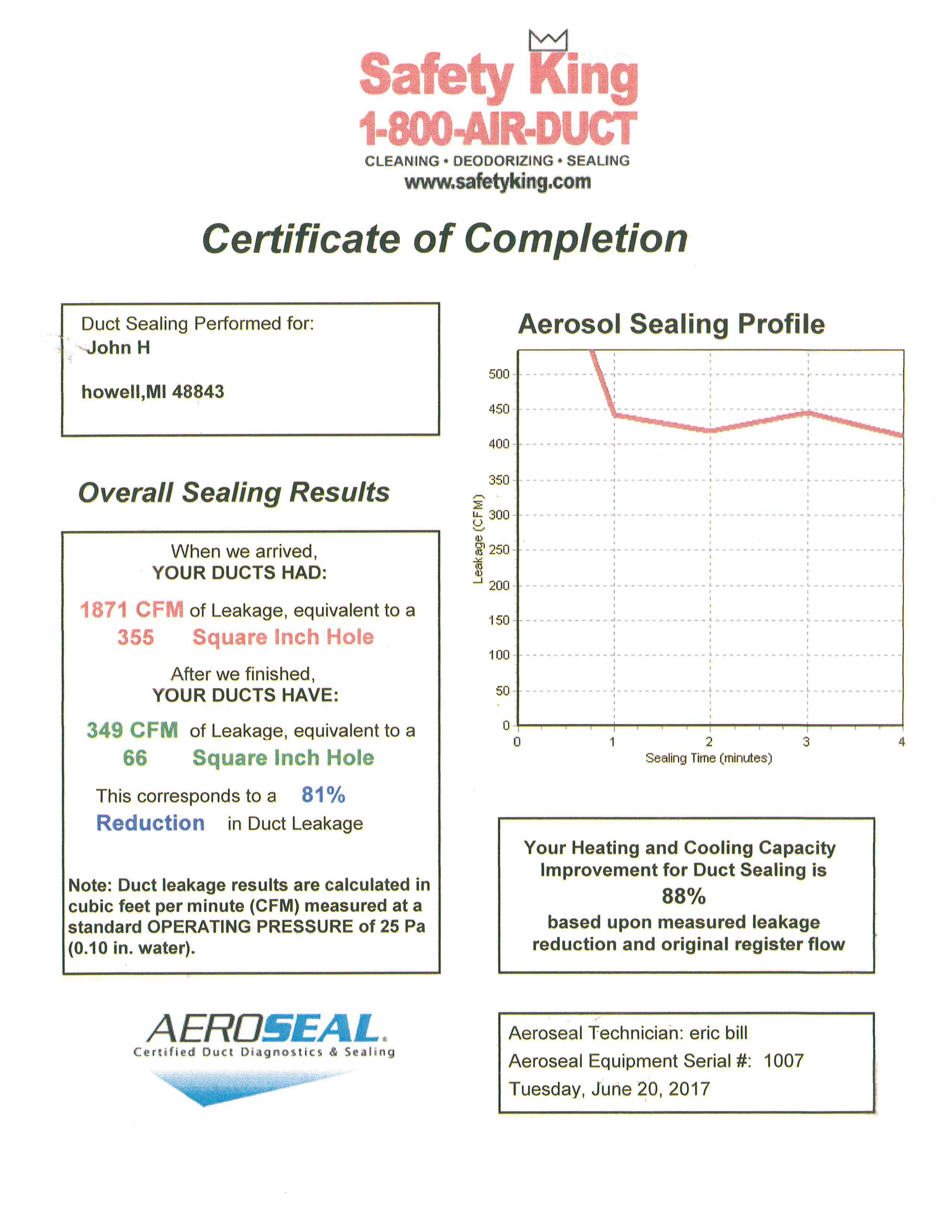 Our Aeroseal specialists have been working hard as the demand for sealed air ducts increases. You can see the results of our process by viewing any of the Certificates of Completion below. Each set of two certificates is the supply and return side of an HVAC system.