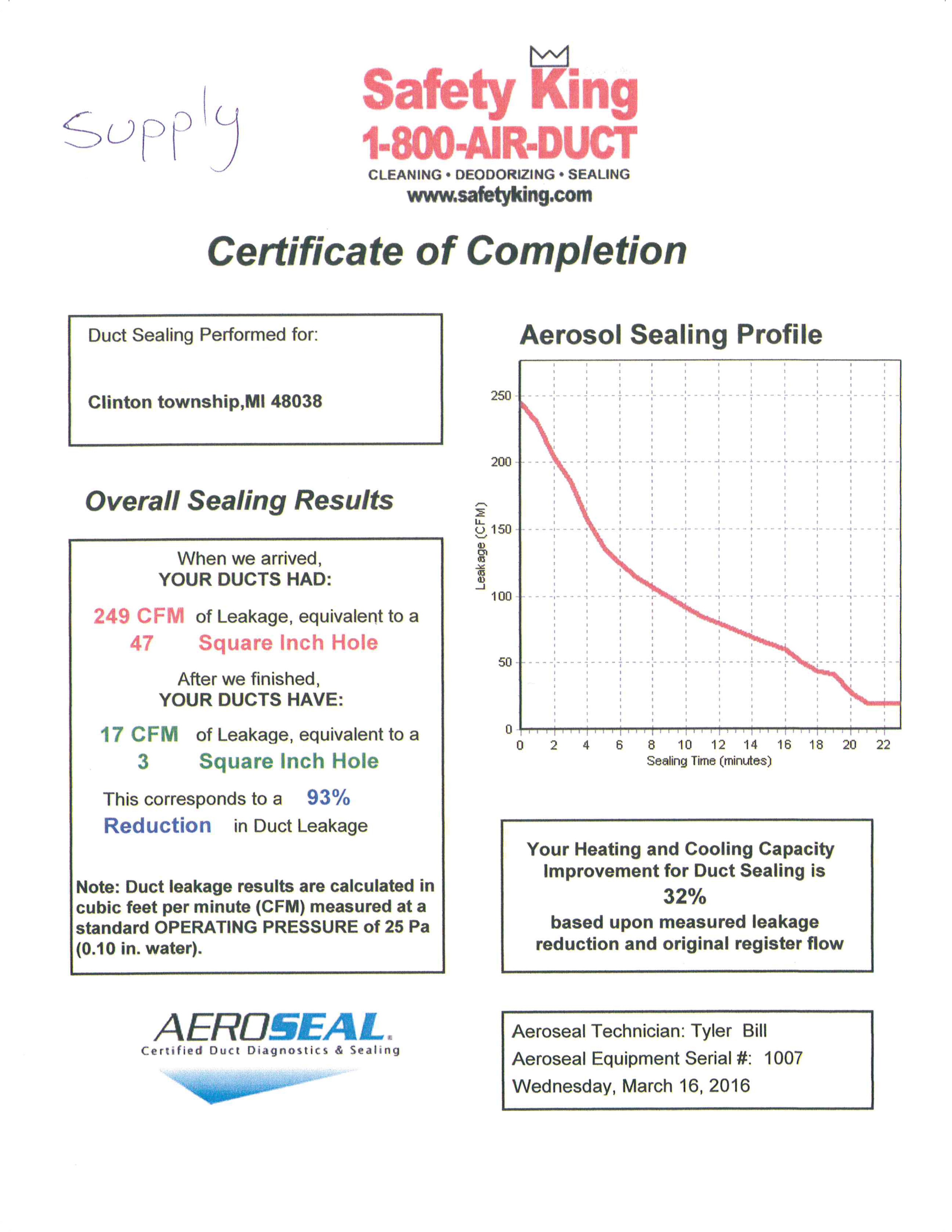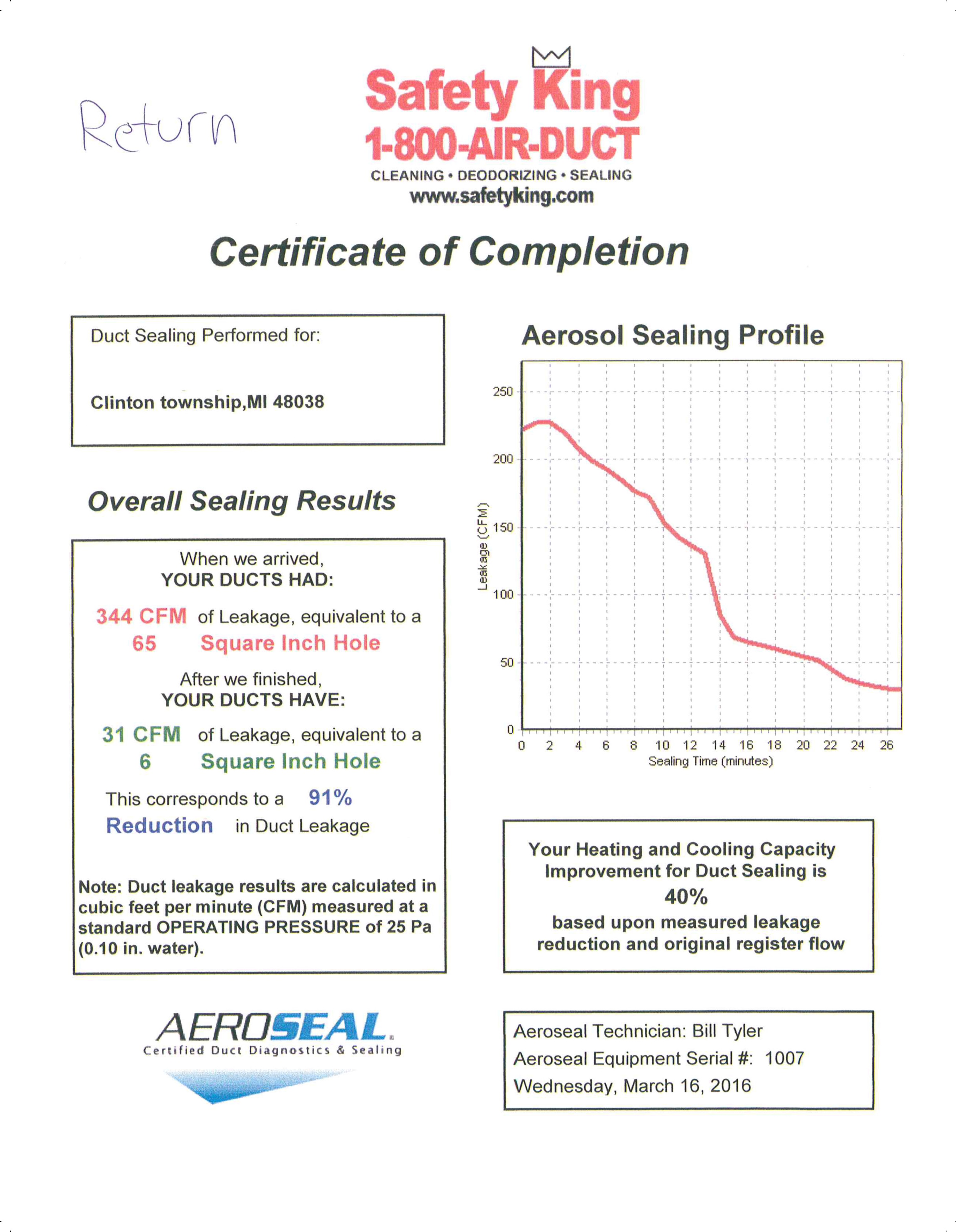 The images on the right show the Certificates of Completion generated after our most recent Aeroseal Duct Sealing. A certificate is generated for both the supply, and return side of your HVAC system. Click on one for a closer look.